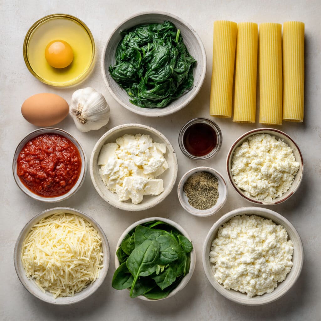 Ingredients in Spinach and Ricotta Stuffed Manicotti
