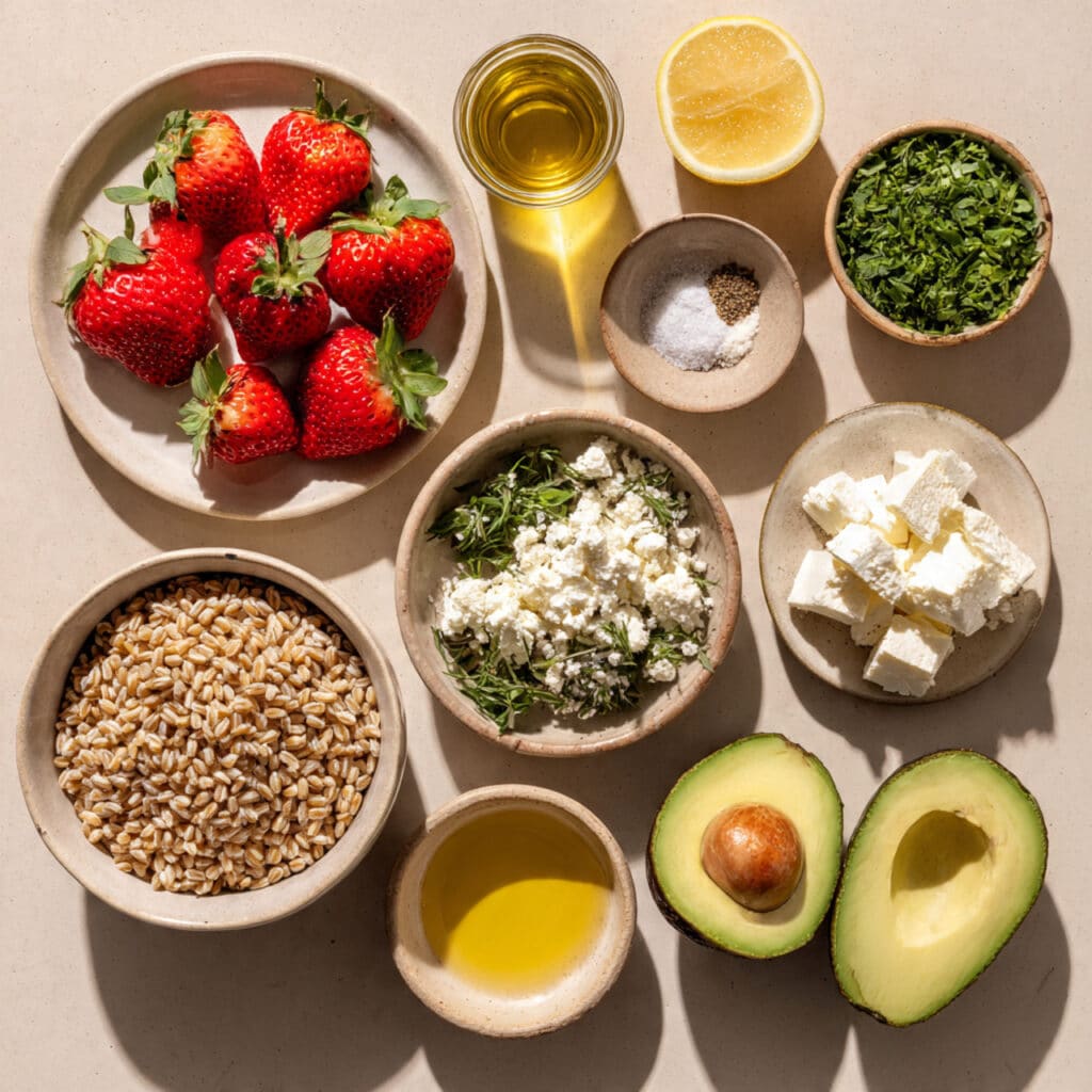 A fresh and vibrant salad combining sweet strawberries, creamy avocado, and chewy farro, tossed in a light lemon honey dressing for a perfectly balanced bite.
