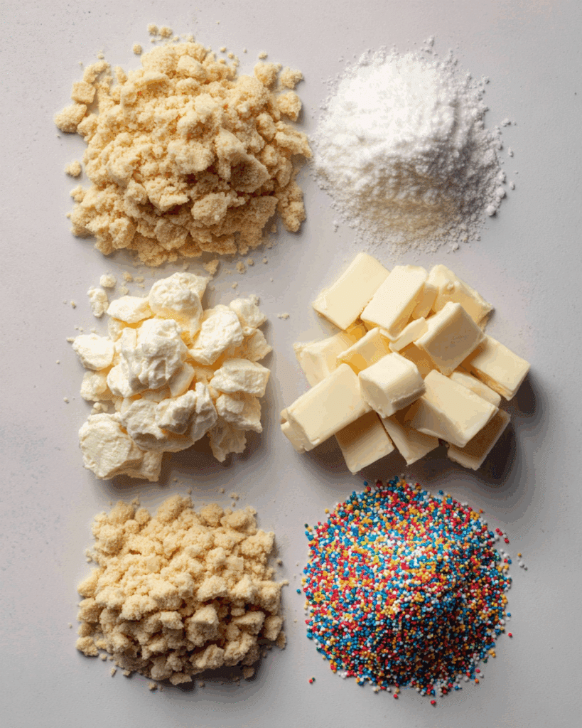 - Sugar Cookies: 2 ½ cups (crumbled, about 8-10 soft cookies) Crushed into fine crumbs, these are the flavorful base.