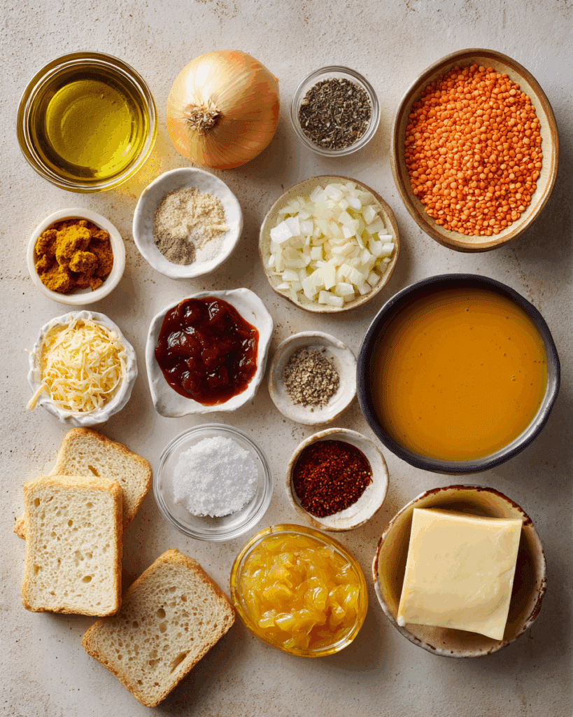 Ingredients in Tikka Red Lentil Soup and Mango Chutney Onion Cheese Toasties
