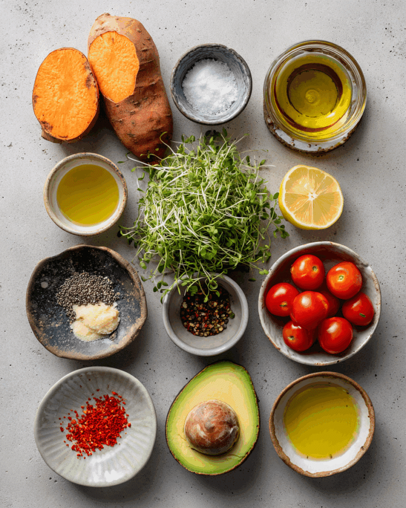 - Sweet Potatoes: 2 medium, washed and unpeeled — the base of the toast, naturally sweet and earthy.
