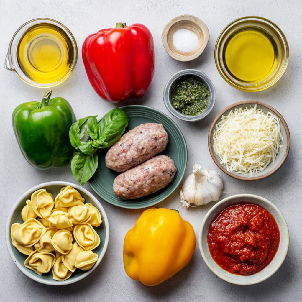 Now the fun part begins, because this recipe gets its magic from a simple lineup of ingredients that each bring something important to the pan. The sausage adds richness, the peppers bring sweetness and color, and the tortellini turns the whole thing into a cozy, satisfying dinner.