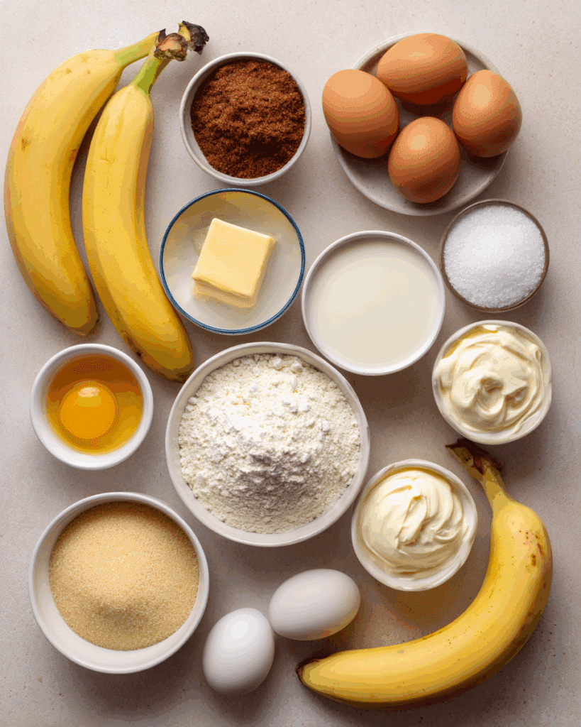 - Bananas: 2 large for topping + 2 medium ripe for the batter. Adds moisture and sweetness.