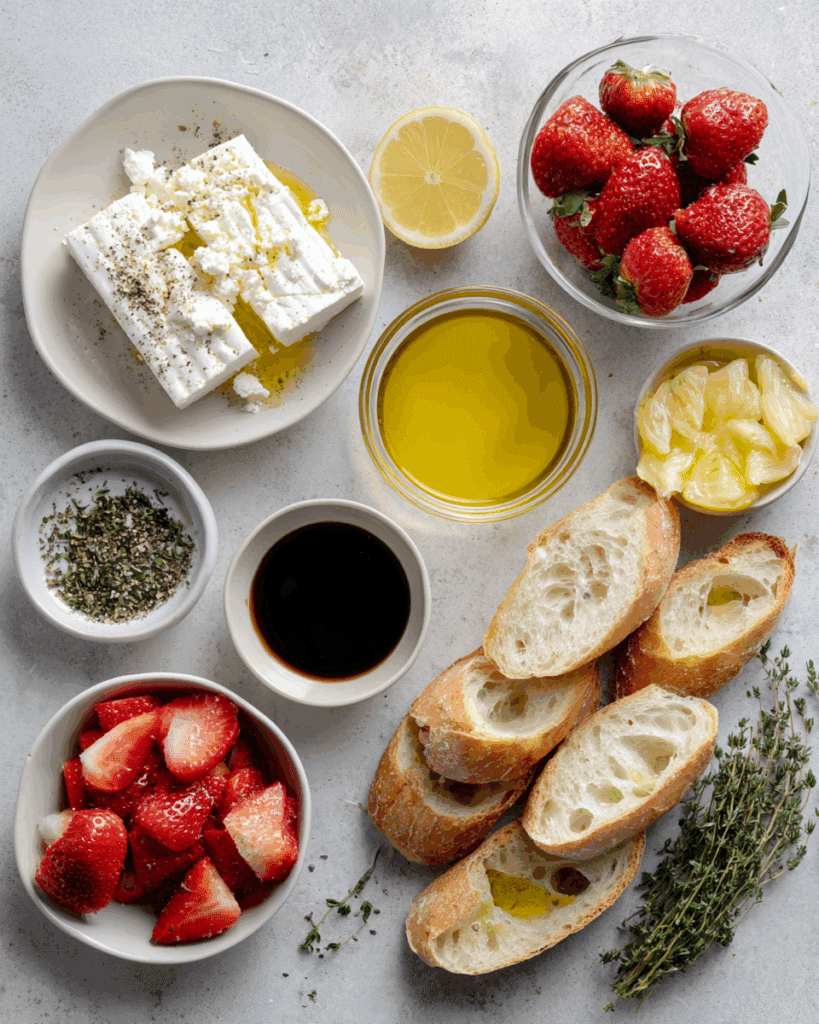 The magic of this dish lies in contrast. The whipped feta is silky, salty, and cool. The strawberries are warm, soft, and sweet. The olive oil adds a fruity richness while the lemon zest and thyme pop with brightness. Every bite hits different notes—tangy, sweet, creamy, and herby—coming together into one unforgettable mouthful.