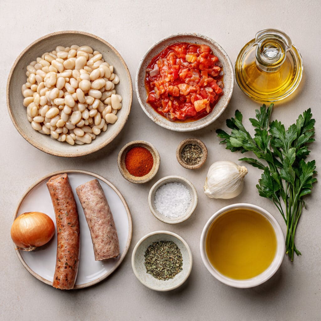 A hearty one-skillet meal made with creamy white beans, smoky sausage, garlic, onions, and a light tomato broth. Simple ingredients come together for a warm, comforting dish that is perfect for busy weeknights and satisfying family dinners.