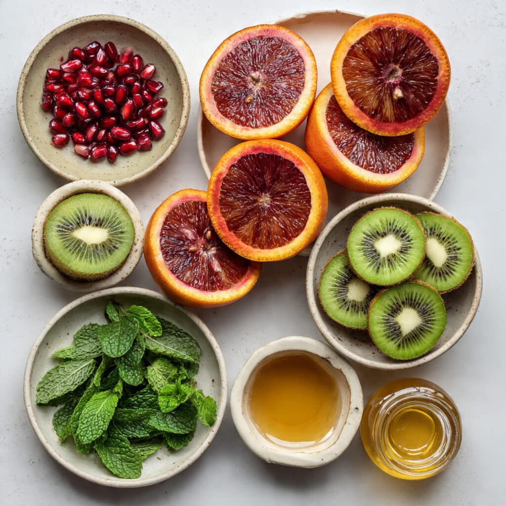 A refreshing and vibrant winter fruit salad featuring blood oranges, kiwi, pomegranate seeds, fresh mint, and a drizzle of honey. Perfect for breakfast, dessert, or a light snack.