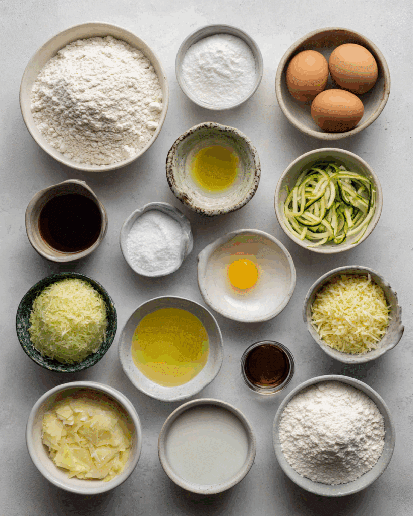 - Zucchini: 1 ½ cups, finely grated and drained – Adds moisture, texture, and a beautiful speckled look.